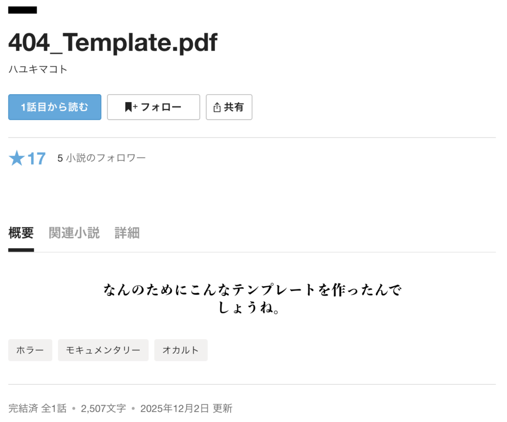 2025.12 2026年1月3日 最終更新日時 : 2026年1月3日 kagami_zu 題:404_Template.pdf著:ハユキマコト 作品リンク:カクヨム https://kakuyomu.jp/works/822139840590166012 体験制度よりお申し込み受付中です アンケ回答は終了いたしました 2512_墨消し済み ファイルリンク リンクで開くダウンロード